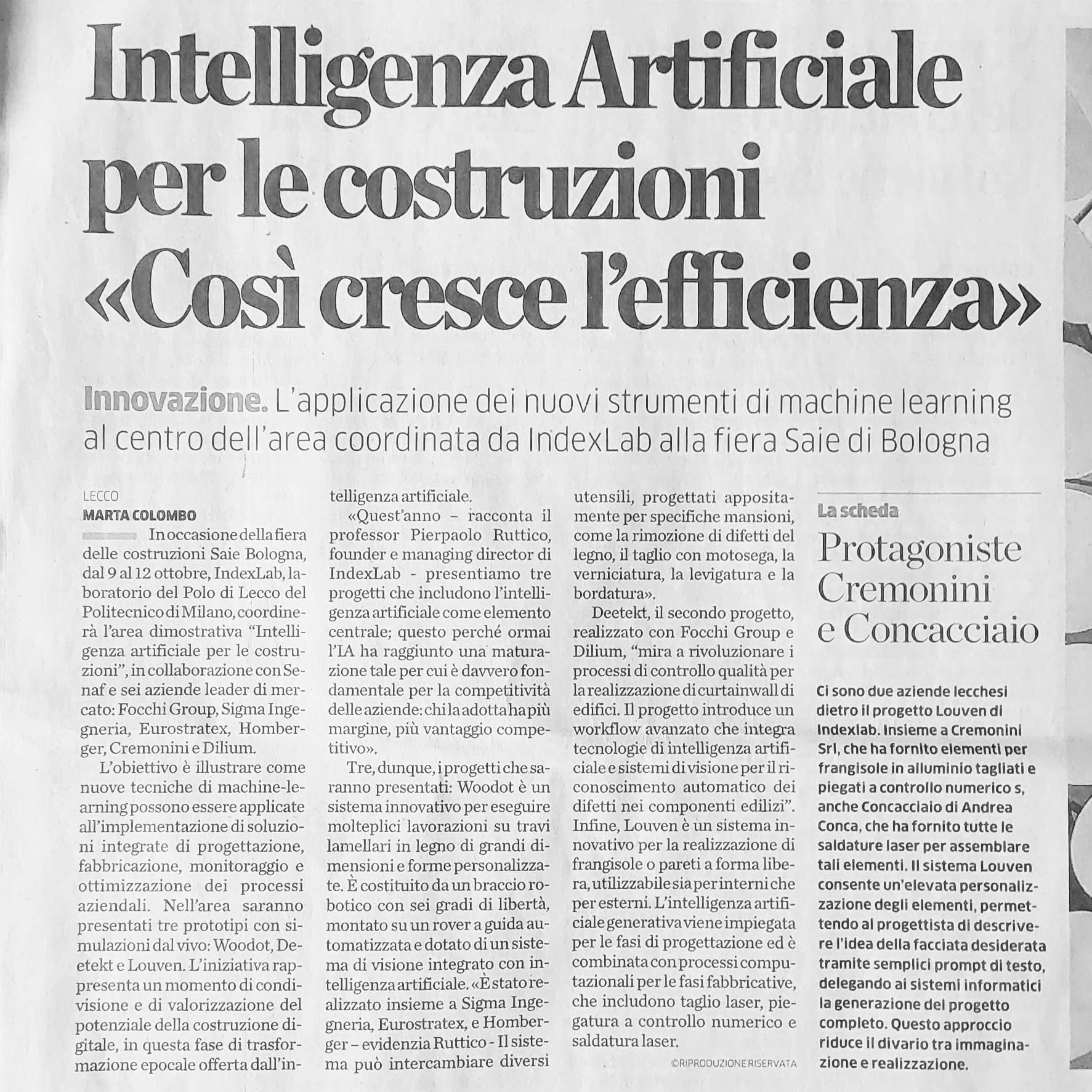At the SAIE Bologna 2024 construction fair, taking place from October 9 to 12, INDEXLAB – Politecnico di Milano coordinates the demonstration area "ARTIFICIAL INTELLIGENCE FOR CONSTRUCTION", in collaboration with Senaf and six leading market companies: Focchi Group, Sigma Ingegneria, Eurostratex, Homberger, Cremonini, and Dilium. The goal is to demonstrate how new machine-learning techniques can be applied to implement integrated solutions for designing, manufacturing, monitoring, and optimizing business processes. The area presents three prototypes with live simulations: Woodot, Deetekt, and Louven. This initiative represents a moment of sharing and highlighting the potential of digital construction in this era of transformation driven by artificial intelligence.